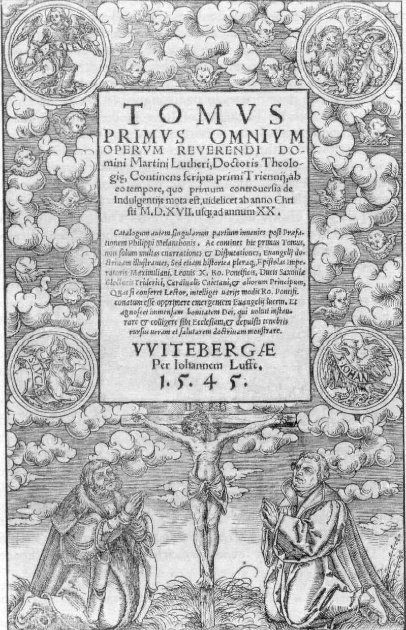 (1.Auflage); Bd. 3 (1560) zeigen Luther und den Kurfürsten (Joh. Friedrich) unter dem Kreuz. darüber #w2 V · D · M · I · Æ · ![]() Ab der 2. Auflage wird das untere Bild verwendet. hier aus Bd.3 |